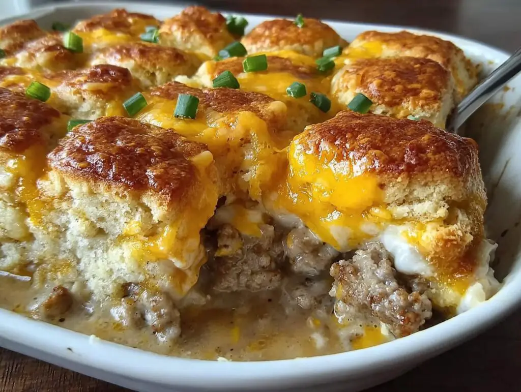 - Step 7: Once it’s out of the oven, let your homemade biscuit gravy casserole rest for about 5-10 minutes. This allows the gravy to set up perfectly. Just before serving, sprinkle the sliced green onions over the top and add a crack of fresh black pepper. Serve warm with extra butter on the side – it’s pure comfort!