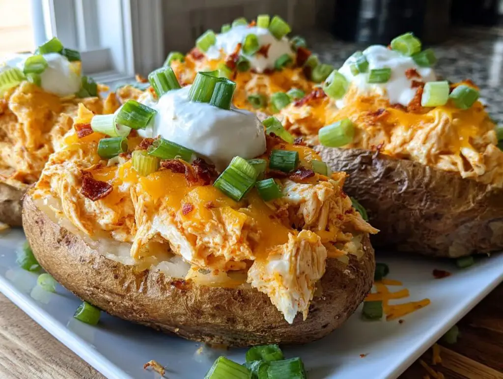 Enjoy delicious Buffalo Chicken Baked Potatoes, a flavorful combination of spicy buffalo chicken, melted cheese, and creamy toppings stuffed into fluffy baked potatoes. This easy recipe is perfect for a satisfying meal or a game day treat.