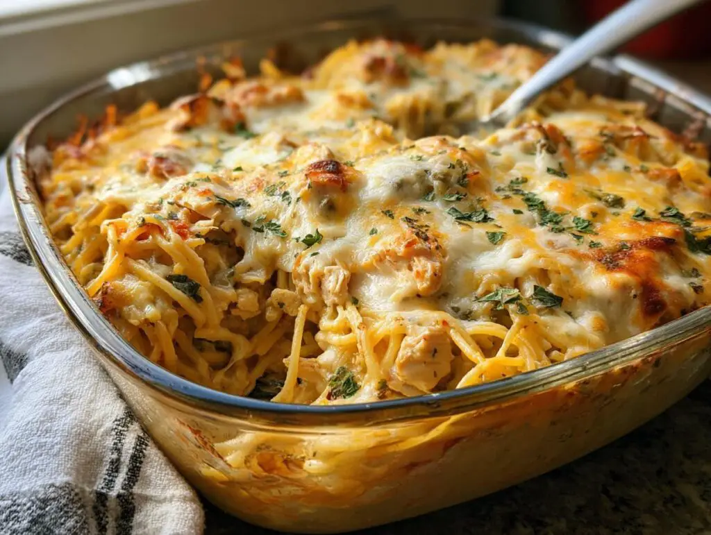 A comforting, creamy, and cheesy chicken spaghetti casserole perfect for weeknights or weekend dinners. This easy homemade chicken spaghetti bake features tender chicken, pasta, and a rich sauce.