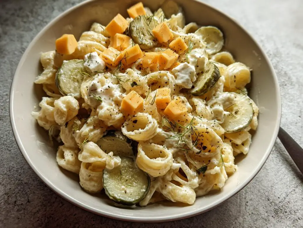 A tangy, creamy pasta salad packed with dill pickles, fresh dill, and a zesty dressing. This easy dill pickle pasta recipe is perfect for potlucks, BBQs, or as a make-ahead lunch.