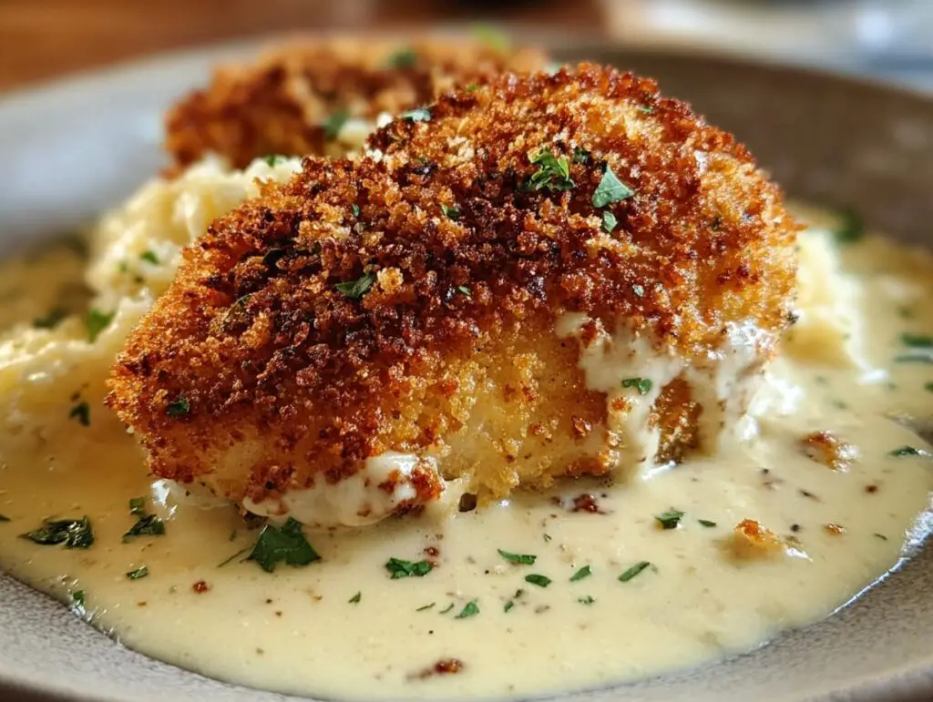 A comforting and flavorful dish featuring tender chicken breasts coated in a crispy Parmesan crust, pan-fried to golden perfection, and served in a rich, creamy garlic sauce.