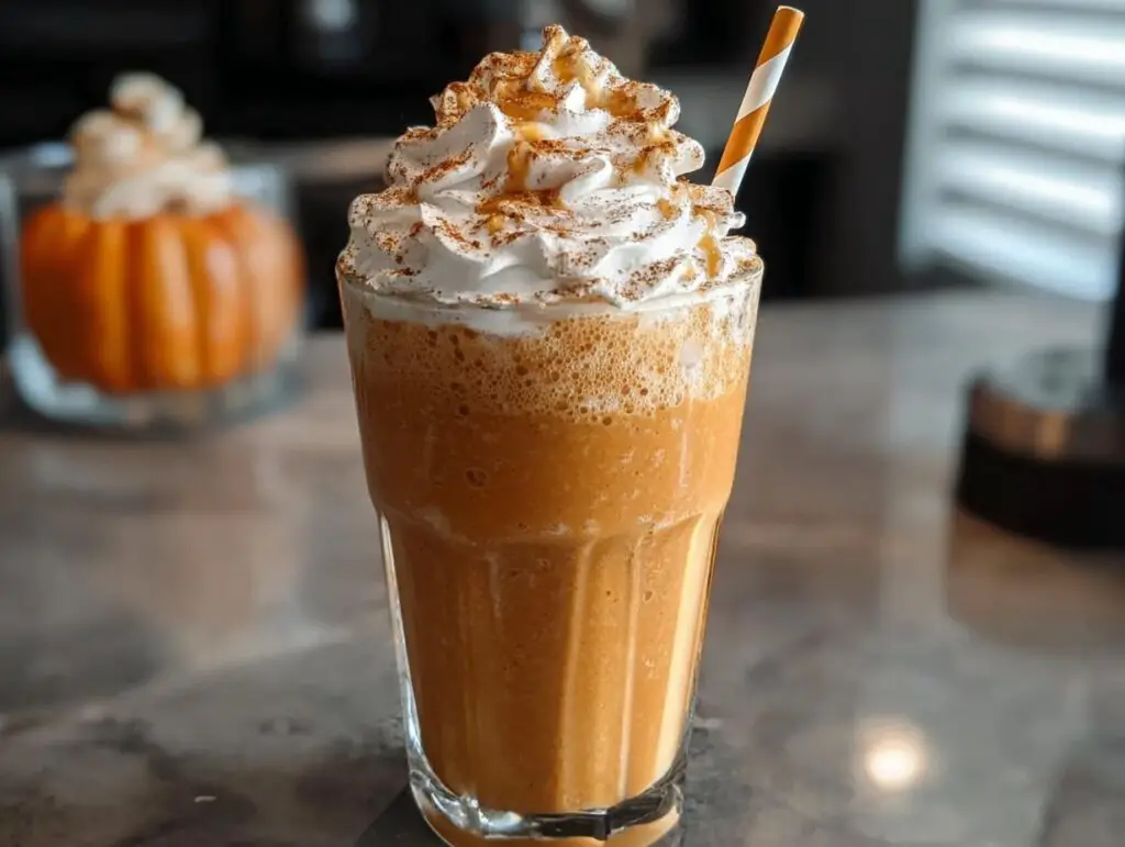 Indulge in a creamy and frosty Pumpkin Spice Frappe, a homemade coffeehouse-style drink perfect for autumn. This easy recipe blends espresso, pumpkin puree, and warm spices for a delightful fall treat.