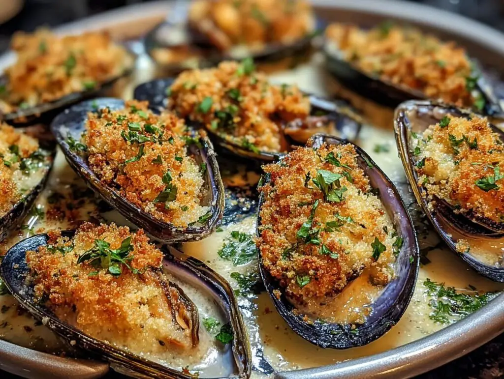 Irresistible baked mussels stuffed with a flavorful breadcrumb mixture, perfect as a quick and elegant appetizer for any occasion.