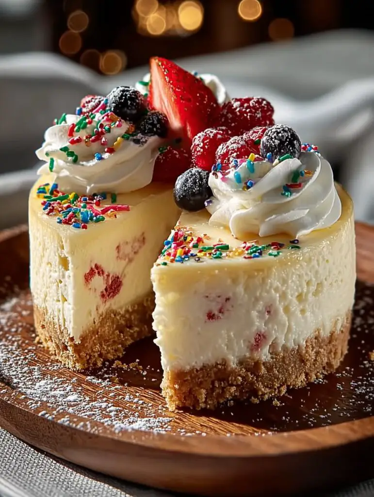 If you’re looking for a festive touch, try a Sugar Cookie Cheesecake with Sprinkles. Adding colorful sprinkles to the cheesecake batter or as a topping not only enhances the visual appeal but also adds a playful twist that kids and adults will love.
